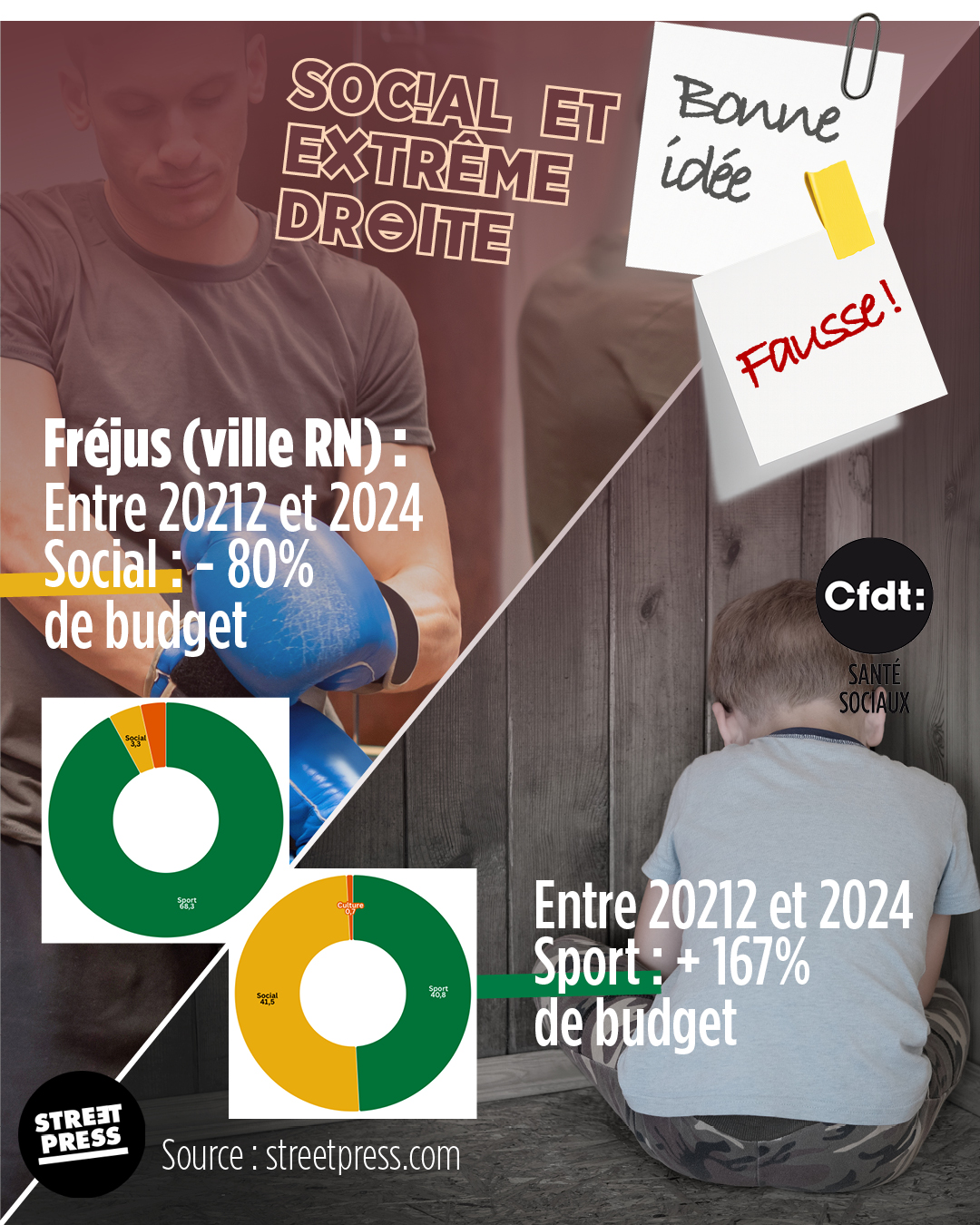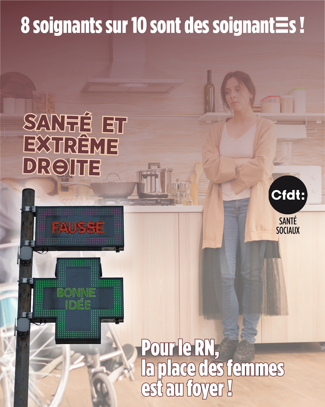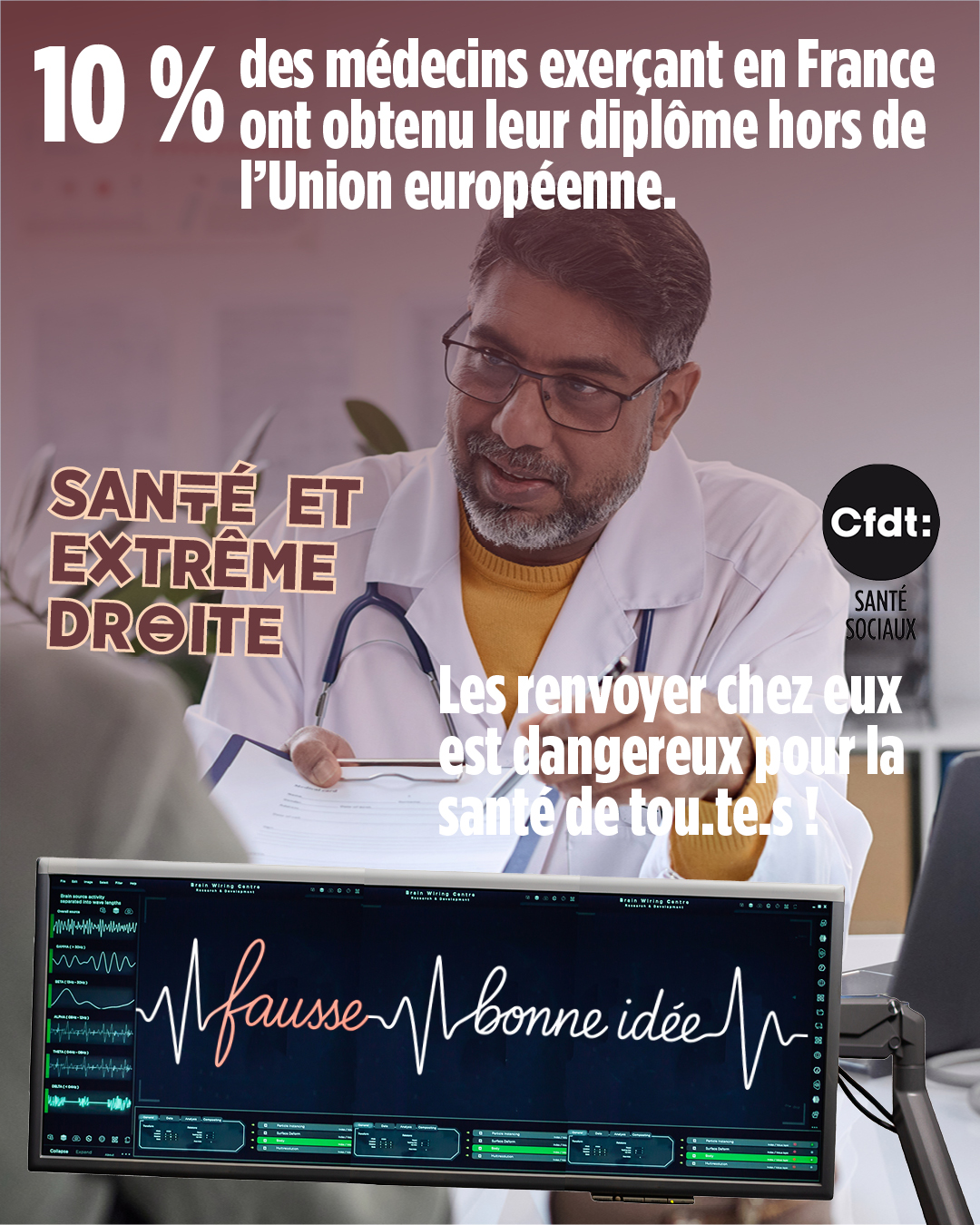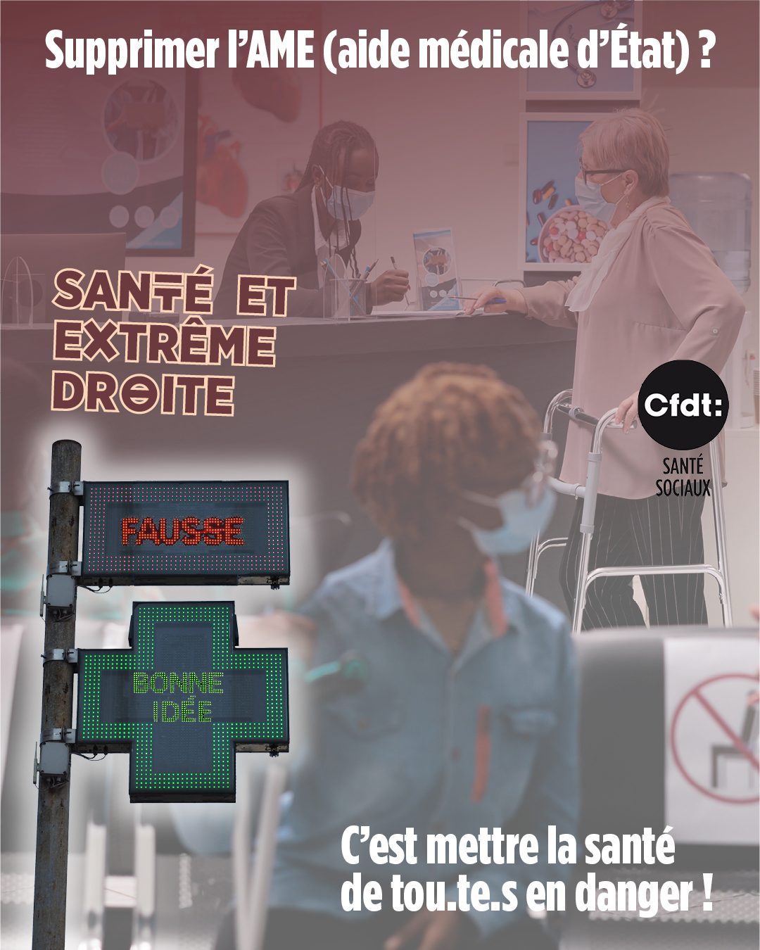 Voici quelques visuels pour les réseaux sociaux ou pour des affichages. Non le programme de l'extrême droite n'est pas une bonne chose pour les secteurs de la santé, du social et du médico-social. La fédération a travaillé les programmes, comparé et analysé. Avec un pouvoir d'extrême droite, la solidarité, les droits des travailleurs, et finalement la santé de la tou.te.s régressent.