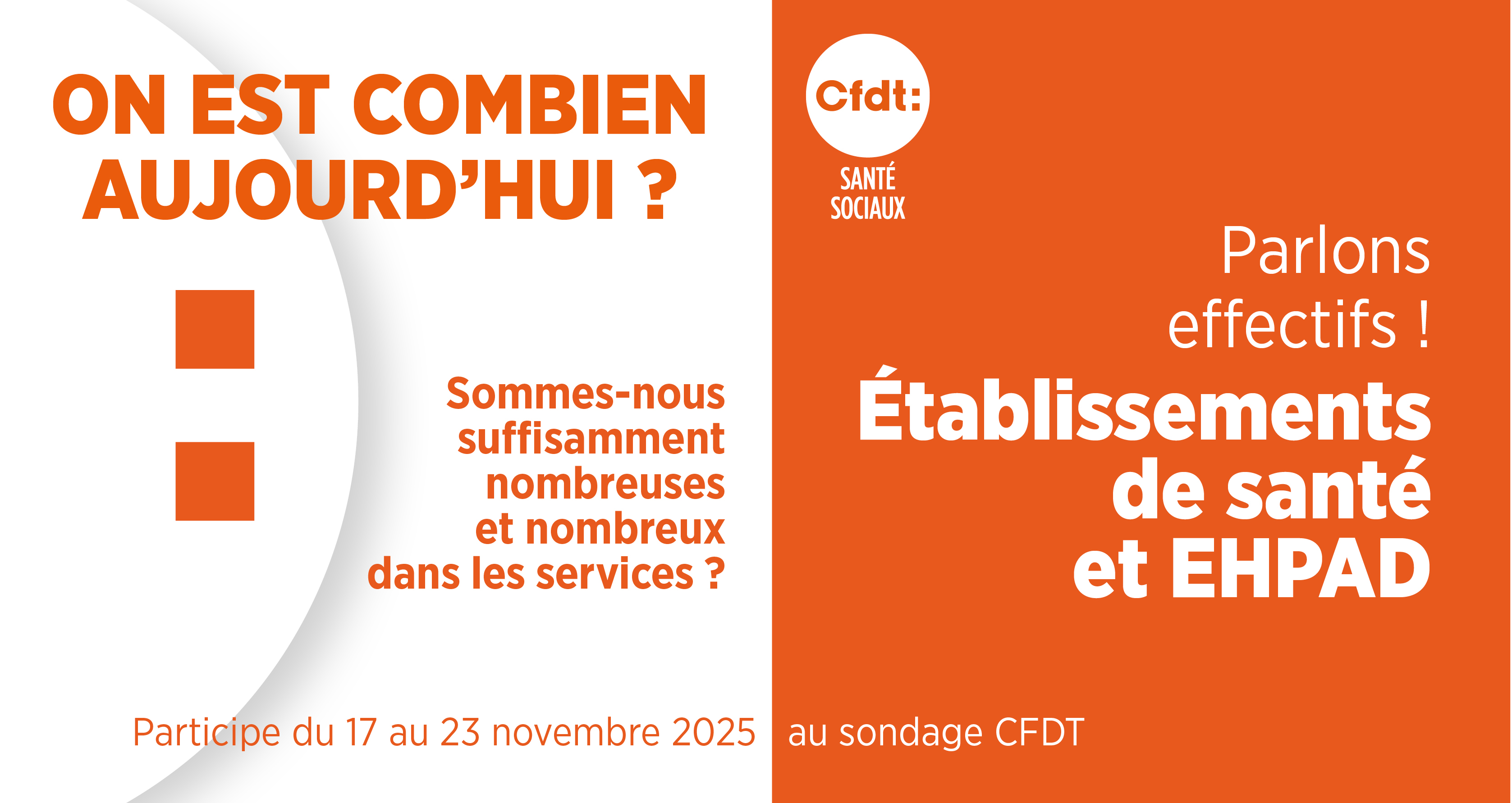 Cette enquête se tiendra uniquement du 17 au 23 novembre 2025. La CFDT santé-sociaux a décidé de réitérer l’enquête Effectifs, déjà réalisée en 2017, 2018, 2019, 2023 et 2024 dans les établissements de santé et Ehpad.