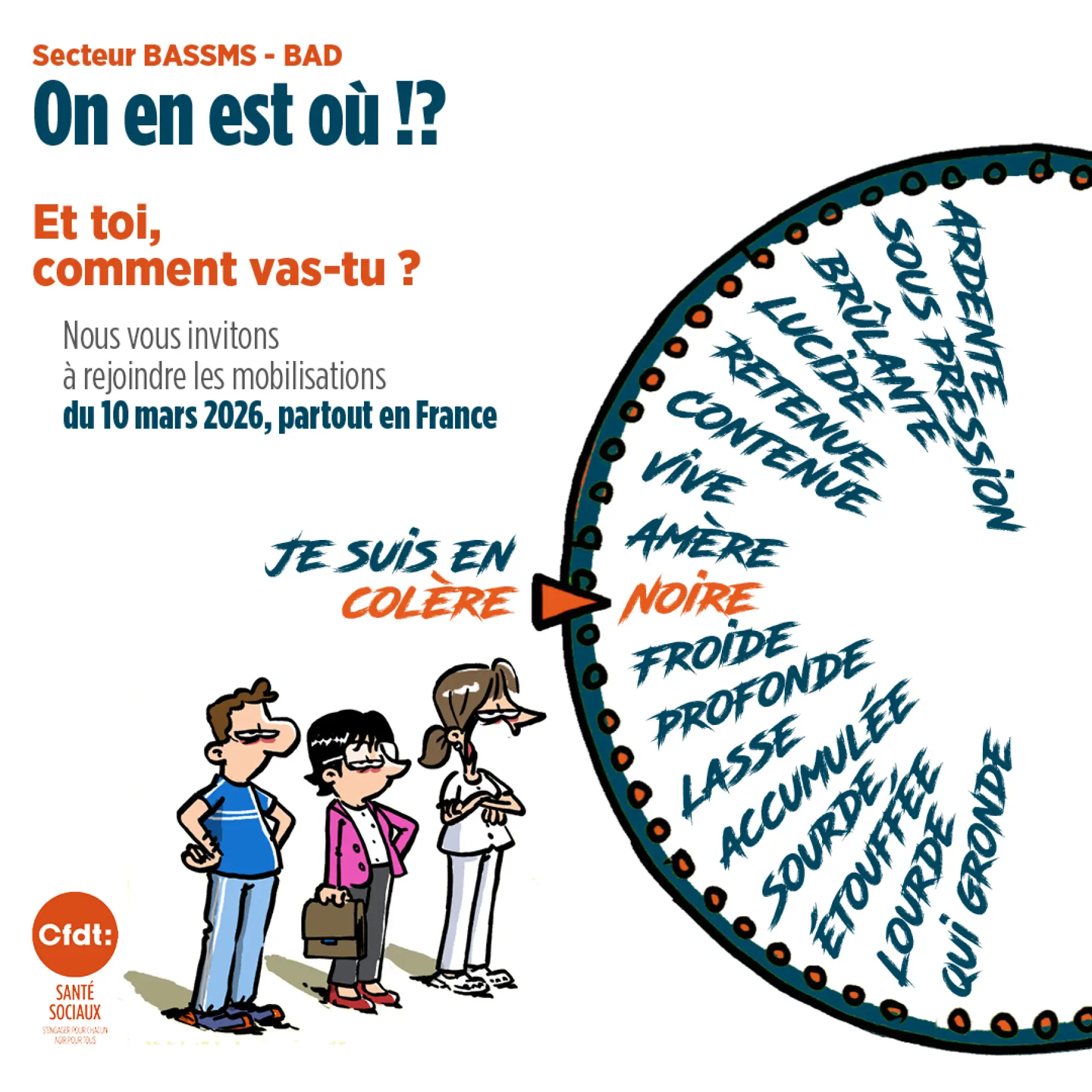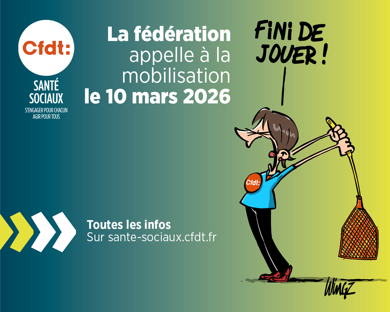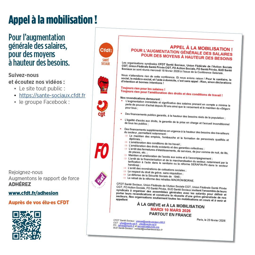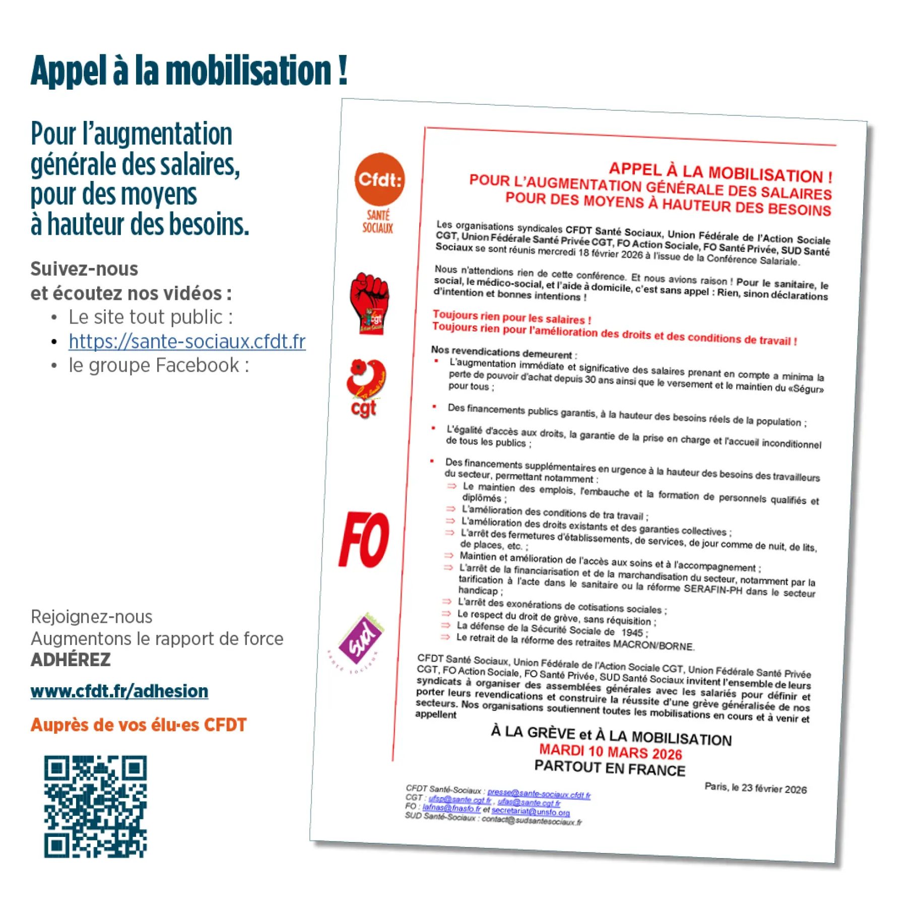 CFDT Santé Sociaux, Union Fédérale de l’Action Sociale CGT, Union Fédérale Santé Privée CGT, FO Action Sociale, FO Santé Privée, SUD Santé Sociaux invitent l’ensemble de leurs syndicats à organiser des assemblées générales avec les salariés pour définir et porter leurs revendications et construire la réussite d’une grève généralisée de nos secteurs. Nos organisations soutiennent toutes les mobilisations en cours et à venir et appellent À LA GRÈVE et À LA MOBILISATION MARDI 10 MARS 2026 PARTOUT EN FRANCE