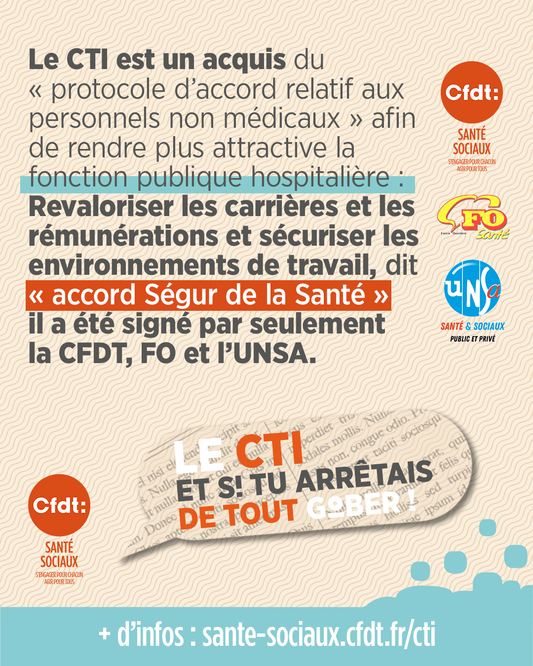 Le CTI est un acquis du « protocole d’accord relatif aux personnel·les non médicaux », afin de rendre plus attractive la fonction publique hospitalière : Revaloriser les carrières, les rémunérations et sécuriser les environnements de travail, dit « accord Ségur de la Santé » il a été signé par seulement 3 organisations syndicales : la CFDT, FO et l’UNSA.